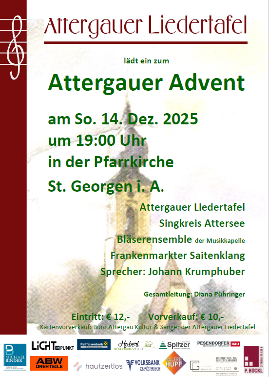 Inzwischen gehört er im Attergau zur Adventszeit wie der Nikolaus – der Attergauer Advent. Das traditionelle Konzert wird jedes Jahr von der Attergauer Liedertafel gestaltet. Der 1905 gegründete Männerchor lädt auch heuer wieder zur besinnlichen Einstimmung in die Pfarrkirchen St. Georgen im Attergau.